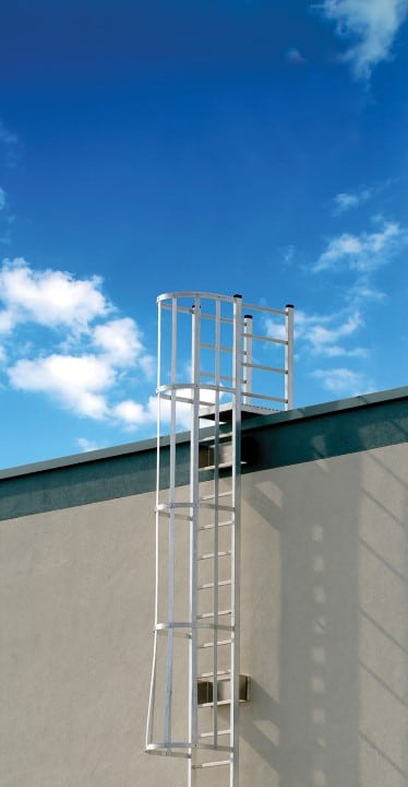 A cage ladder is typically used for easy roof and mezzanine access, high or hazardous locations such as areas in close proximity to a roof edge or high-voltage power lines, outdoor advertising, access to interior roof or floor hatches, elevator pits, and for manhole access, and door/wall hatch access.